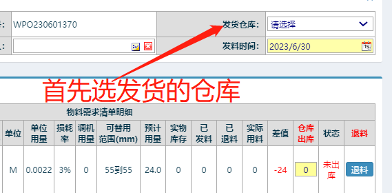 :點(diǎn)晴ERP-半成品工單發(fā)料操作流程![]() 1. 點(diǎn)擊進(jìn)入 如下圖: 2. 找到半成品的工單點(diǎn)中后,再點(diǎn)擊出庫 如下圖: 3. 首先選擇發(fā)貨的倉庫 如下圖: 4. 點(diǎn)中黃色方框挑選出貨的明細(xì) 如下圖: