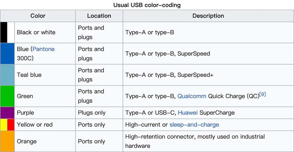 在實際生活中,當(dāng)我們仔細(xì)觀察手機(jī)、電視、電腦、音箱等電子設(shè)備時,就會發(fā)現(xiàn)USB端口的顏色有很多。單純的你可能會認(rèn)為只是為了好看,實際上不同的顏色代表著不同性能。USB通用串行總線(Universal Serial Bus)是一種串口總線標(biāo)準(zhǔn),也是一種輸入輸出接口的技術(shù)規(guī)范,在1994年底由英特爾等多家公司聯(lián)合在1996年推出后,已成功替代串口和并口,已成為當(dāng)今電腦與大量智能設(shè)備的必配接口。USB是一個外部總線標(biāo)準(zhǔn),規(guī)范電腦與外部設(shè)備的連接和通訊,具有熱插拔功能,可連接多種外設(shè),被廣泛地應(yīng)用于個人電腦和移動設(shè)備等信息通訊產(chǎn)品,并擴(kuò)展至攝影器材、數(shù)字電視(機(jī)頂盒)、游戲機(jī)等其它相關(guān)領(lǐng)域。(1)可以熱插拔,就是用戶在使用外接設(shè)備時,不需要關(guān)機(jī)再開機(jī)等動作,而是在電腦工作時,直接將USB插上使用;(2)攜帶方便,USB設(shè)備大多以“小、輕、薄”見長,對用戶來說,隨身攜帶大量數(shù)據(jù)時,很方便;(3)標(biāo)準(zhǔn)統(tǒng)一,USB接口可以將應(yīng)用外設(shè)與個人電腦連接,如USB硬盤、USB鼠標(biāo)、USB打印機(jī)等等;(4)可以連接多個設(shè)備,USB在個人電腦上往往具有多個接口,可以同時連接多個設(shè)備,非常方便。黑色/白色:屬于USB1.0/2.0時代,是最傳統(tǒng)的速度,理論上速度偏慢,只有60MB/s左右,充電的速度也很慢;黃色:USB2.0接口,傳輸速度有限,但是它可以支持關(guān)機(jī)后充電功能;深藍(lán)色:屬于USB3.0時代,理論上最大的速度在640MB/s,速度相比上一代快很多;淺藍(lán)色:屬于USB3.1時代,理論上最大的傳輸速度在1280MB/s;綠色:代表支持高通QC快充電技術(shù),不是很常見的接口;紅色:USB3.1接口,傳輸速度大幅度上升,依然是1280MB/s,可以支持關(guān)機(jī)后充電;橙色:依然支持關(guān)機(jī)充電,也是一些品牌的快充接口,不是很常見;紫色:USB3.1接口,它是華為的快充專屬接口,速度依然能達(dá)到1280MB/s。總之,USB接口的顏色代表著不同的傳輸速度、功率和設(shè)備類型,在日常生活中我們僅需要記住自己常用的就能完成自己的需求,切勿將規(guī)格不和的接口混插以免造成不必要的損失。