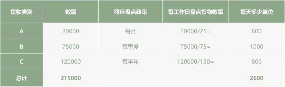 這三類物品的盤點(diǎn)沒有固定的數(shù)量。然而,典型的流程對于貨物類別“A”具有 6 次盤點(diǎn)的頻率,對于類別“B”具有 2 次盤點(diǎn),對于類別“C”具有 1 次盤點(diǎn)的頻率。雖然 ABC 分析通過關(guān)注高價值貨物在管理庫存的財(cái)務(wù)方面很有用,但它可能會導(dǎo)致“C”類商品的發(fā)貨延遲。 ABC 循環(huán)盤點(diǎn)示例: 假設(shè)一家公司為其庫存建立了ABC類別,即: 貨物A=20, 000(單位) 貨物B=75,000(單位) 貨物C=120,000(單位) 貨物總數(shù)=215,000(單位) 計(jì)算每天所需的盤點(diǎn)數(shù): 公司的政策是每月(25個工作日)統(tǒng)計(jì)A類貨物,每季度(75個工作日)統(tǒng)計(jì)B類貨物,每六個月(150個工作日)統(tǒng)計(jì)C類貨物。