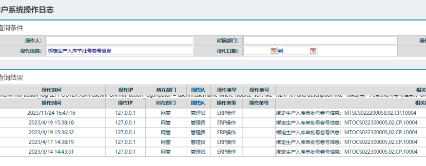 :點(diǎn)晴ERP-查詢生產(chǎn)入庫標(biāo)簽的制作人是誰![]() 情況描述:查詢生產(chǎn)入庫標(biāo)簽的制作人是誰,該如何操作 操作流程: 點(diǎn)擊進(jìn)入 如下圖: 到用戶操作日志查詢,“綁定生產(chǎn)入庫單批號卷號信息”輸入在操作信息上,然后查詢。 如下圖: ![]() 點(diǎn)晴模切ERP更多信息:http://moqie.clicksun.cn,聯(lián)系電話:4001861886 該文章在 2023/11/24 17:13:09 編輯過 |