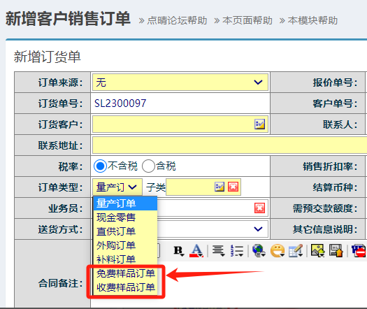 :點(diǎn)晴ERP-銷售訂單按樣品下單操作流程![]() 下樣品訂單時(shí)有兩個(gè)類型,一個(gè)收費(fèi),一個(gè)免費(fèi),按需選擇 如下圖: ![]() 其他操作跟正常下單一樣。 點(diǎn)晴模切ERP更多信息:http://moqie.clicksun.cn,聯(lián)系電話:4001861886 該文章在 2023/11/28 11:31:26 編輯過 |