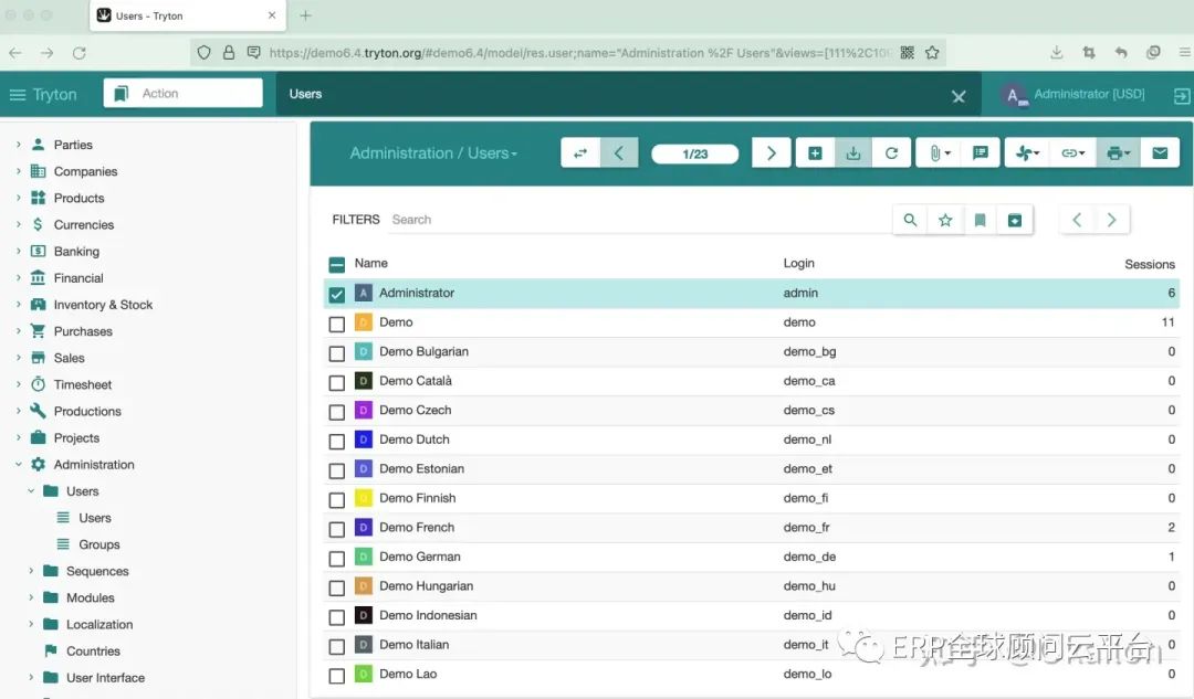 圖2:ERPNext銷售訂單界面 1)功能特點: ERPNext提供了一系列的模塊,涵蓋多個業(yè)務領域,包括會計、庫存管理、銷售、采購、人力資源等。 具備儀表板和報告功能,使用戶能夠?qū)崟r監(jiān)控業(yè)務績效。支持多語言和多貨幣。提供移動端應用,方便用戶在移動設備上訪問系統(tǒng)。 2)技術棧: ERPNext主要使用Python編寫,基于Web框架Frappe Framework。使用MariaDB作為默認的數(shù)據(jù)庫管理系統(tǒng)。前端采用Javascript和jQuery。 3)模塊化設計: ERPNext的模塊化設計使得用戶可以根據(jù)其業(yè)務需求選擇性地啟用不同的功能模塊,從而定制系統(tǒng)以滿足特定的業(yè)務流程。 4)部署方式: 用戶可以選擇在本地服務器上部署ERPNext,也可以使用云服務進行部署。ERPNext提供了Docker鏡像,簡化了部署過程。 5)開源許可: ERPNext采用GNU通用公共許可證(GNU General Public License,GPL)。 NO3.Tryton ERP Tryton是一款開源的企業(yè)資源計劃(ERP)軟件,旨在提供一套靈活、模塊化和可擴展的解決方案。