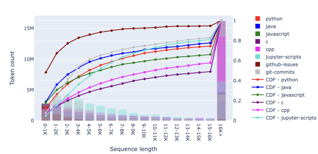 從更廣泛的視角來看,考慮到其他編程語言,可以明顯看到較長(zhǎng)的代碼文件比 Web 文檔更多。如果排除 C 語言和 Javascript,我們會(huì)發(fā)現(xiàn)大約 50-70% 的詞元來自少于 8,000 個(gè)詞元的文件,而對(duì)于 RefinedWeb 數(shù)據(jù)集,這一比例接近 80%。