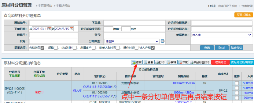 點(diǎn)中一條分切單信息后再點(diǎn)結(jié)案按鈕 如下圖