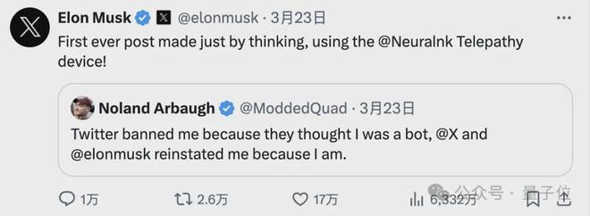 他稱自己以前在操作ipad等電子產(chǎn)品時(shí),就是嘴里叼一根棒子(mouth stick)來進(jìn)行,但時(shí)間久了很累甚至?xí)a(chǎn)生痙攣。 現(xiàn)在有了腦機(jī)接口,他直接打一宿游戲都不累(旺柴),這真正改變了他的生活。 首條推特“鬧烏龍” 幾天前,Noland Arbaugh正式用意念控制發(fā)布了他的第一條推特(馬斯克也轉(zhuǎn)發(fā)了)。