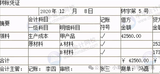 ①收款憑證填制要求: · 收款憑證左上角的“借方科目”按收款的性質(zhì)填寫“庫存現(xiàn)金”或“銀行存款”。 · 日期填寫的是填制本憑證的日期。 · 右上角填寫填制收款憑證的順序號(hào)。 · “摘要”填寫對所記錄的經(jīng)濟(jì)業(yè)務(wù)的簡要說明。 · “貸方科目”填寫與收入“庫存現(xiàn)金”或“銀行存款”相對應(yīng)的會(huì)計(jì)科目。 · “記賬”是指該憑證已登記賬簿的標(biāo)記,防止經(jīng)濟(jì)業(yè)務(wù)重記或漏記。 · “金額”是指該項(xiàng)經(jīng)濟(jì)業(yè)務(wù)的發(fā)生額。 · 該憑證右邊“附件×張”是指本記賬憑證所附原始憑證的張數(shù)。 · 最下邊分別由有關(guān)人員簽章,以明確經(jīng)濟(jì)責(zé)任。 ②付款憑證填制要求: 付款憑證是根據(jù)審核無誤的有關(guān)庫存現(xiàn)金和銀行存款的付款業(yè)務(wù)的原始憑證填制的。付款憑證的填證基本相同,不同的制方法與收款憑證在付款憑證的左上角應(yīng)填列貸方科目,即“庫存現(xiàn)金”或“銀行存款”科目。 ③轉(zhuǎn)賬憑證填制要求: 轉(zhuǎn)賬憑證通常是根據(jù)有關(guān)轉(zhuǎn)賬業(yè)務(wù)的原始憑證填制的。轉(zhuǎn)賬憑證中“總賬科目”和“明細(xì)科目”欄應(yīng)填寫應(yīng)借、應(yīng)貸的總賬科目和明細(xì)科目,借方科目應(yīng)記金額應(yīng)在同一行的“借方金額”欄填列,貸方科目應(yīng)記金額應(yīng)在同一行的“貸方金額”欄填列,“借方金額”欄合計(jì)數(shù)與“貸方金額”欄合計(jì)數(shù)應(yīng)相等。 【例】2020年12月8日,車間生產(chǎn)甲產(chǎn)品領(lǐng)用A材料350公斤,單價(jià)72元,領(lǐng)用B材料560公斤,單價(jià)31元。 借:生產(chǎn)成本——甲產(chǎn)品 42 560 貸:原材料——A材料 25 200 ——B材料 17 360