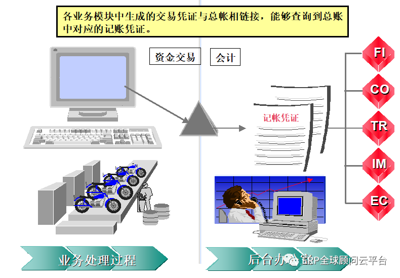 圖的上半部分表示了財務(wù)會計(FI)的核心構(gòu)成,包括總賬、應(yīng)收賬款、應(yīng)付賬款、固定資產(chǎn)、銀行會計、特殊用途擴(kuò)展總賬等。 下半部分(黃色部分)表示了SAP ERP系統(tǒng)其他核心模塊的構(gòu)成,包括采購、倉庫、生產(chǎn)、銷售等。同時,該圖也說明了各模塊與財務(wù)的集成關(guān)系:采購?fù)ㄟ^發(fā)票確認(rèn)與應(yīng)付賬款實時集成;倉庫收發(fā)貨的同時產(chǎn)生財務(wù)憑證,更新總賬;銷售通過開具銷售發(fā)票與應(yīng)收賬款實時集成。