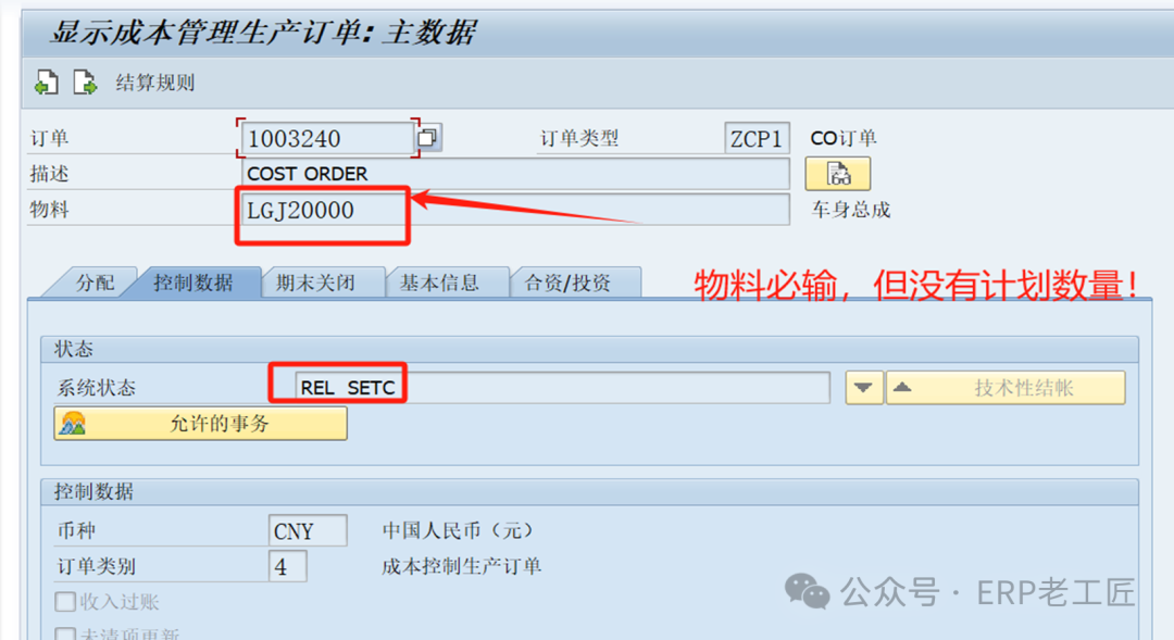 基本概念與應(yīng)用: 成本訂單,也叫CO訂單,SAP官方目錄放在成本對象控制菜單下面,但是我鋈巳銜佑τ媒嵌仁遣緩鮮實(shí)模篊O訂單如果是可以管理產(chǎn)出,那么它的很多特點(diǎn)就很LOW,比如說,默認(rèn)的數(shù)量為1,不方便進(jìn)行狀態(tài)管理等;正是因?yàn)闆]人認(rèn)知到這一點(diǎn),不少項(xiàng)目犯了錯---認(rèn)為沒有生產(chǎn)(BOM,工藝路線)的生產(chǎn)產(chǎn)出應(yīng)該用CO成本訂單,這是大錯而特錯了;如果不能管理產(chǎn)出及過程,只是管理費(fèi)用,它又不夠靈活--遠(yuǎn)沒有內(nèi)部訂單使用起來順手(個(gè)人觀點(diǎn))。因此,長期以來,我沒有找到哪個(gè)場景是最適應(yīng)用CO訂單,反而是發(fā)現(xiàn)了誤用的場景。 CO訂單的特點(diǎn): 1.創(chuàng)建CO訂單時(shí),要輸入物料,但沒有計(jì)劃產(chǎn)量,如下圖: