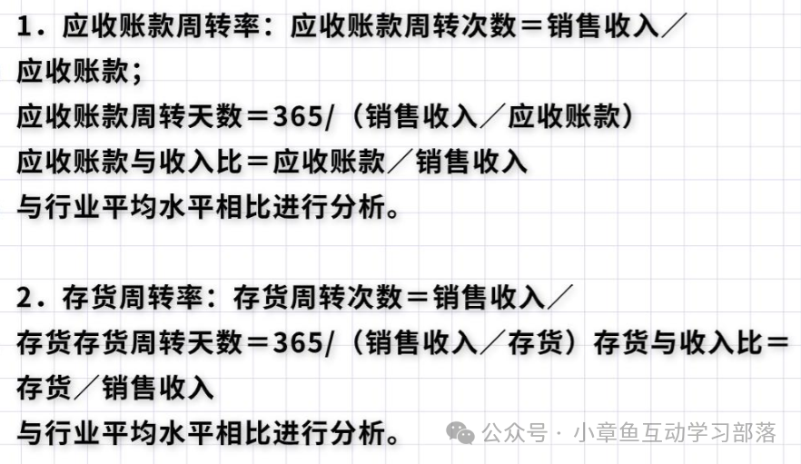 四).營(yíng)運(yùn)能力分析 營(yíng)運(yùn)能力是指通過(guò)企業(yè)生產(chǎn)經(jīng)營(yíng)資金周轉(zhuǎn)速度的有關(guān)指標(biāo)所反映出來(lái)的企業(yè)資金利用的效率,它表明企業(yè)管理人員經(jīng)營(yíng)管理、運(yùn)用資金的能力。企業(yè)生產(chǎn)經(jīng)營(yíng)資金周轉(zhuǎn)的速度越快,表明企業(yè)資金利用的效果越好、效率越高,企業(yè)管理人員的經(jīng)營(yíng)能力越強(qiáng)。 反映企業(yè)營(yíng)運(yùn)能力的財(cái)務(wù)指標(biāo)主要有: 1.應(yīng)收賬款周轉(zhuǎn)率;2.存貨周轉(zhuǎn)率;3.資產(chǎn)周轉(zhuǎn)率。 (一).常用計(jì)算公式: