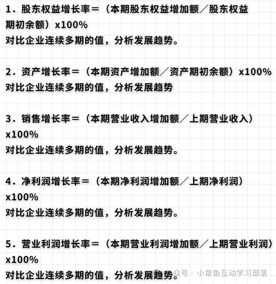 五).發(fā)展能力分析 企業(yè)的發(fā)展能力,也稱企業(yè)的成長(zhǎng)性,它是企業(yè)通過(guò)自身的生產(chǎn)經(jīng)營(yíng)活動(dòng),不斷擴(kuò)大積累而形成的發(fā)展?jié)撃堋F髽I(yè)發(fā)展能力衡量的核心是企業(yè)價(jià)值增長(zhǎng)率。企業(yè)能否健康發(fā)展取決于多種因素,包括外部經(jīng)營(yíng)環(huán)境、企業(yè)內(nèi)在素質(zhì)及資源條件等。 (一).常用計(jì)算公式: