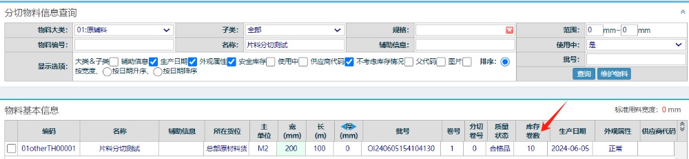 倉(cāng)庫(kù)管理-物料分切管理-新增分切通知單 進(jìn)入界面選擇對(duì)應(yīng)的庫(kù)存 選擇過(guò)來(lái)會(huì)帶上所有的合并卷數(shù) 點(diǎn)擊分切,注意分切資料需要將剩余不變的片料記錄上去。