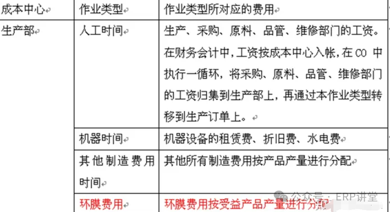 作業(yè)類型 作業(yè)類型用于分配直接人工和制造費用到生產(chǎn)訂單和產(chǎn)品成本上。產(chǎn)成品的工藝路線上規(guī)定需要的每種作業(yè)類型的標(biāo)準(zhǔn)工時,此數(shù)據(jù)由生產(chǎn)部提供。產(chǎn)品生產(chǎn)完工時,系統(tǒng)根據(jù)作業(yè)類型的標(biāo)準(zhǔn)工時和對應(yīng)成本中心上作業(yè)類型的計劃價格計算出每個訂單耗用的直接人工費用和其他每個作業(yè)類型對應(yīng)的制造費用。作業(yè)類型的計劃價格由財務(wù)部根據(jù)每個作業(yè)類型對應(yīng)的計劃成本要素的計劃消耗值和該作業(yè)類型當(dāng)月計劃的耗用數(shù)量計算出來(可以在系統(tǒng)外計算,也可以將成本要素輸入計劃和作業(yè)類型計劃均輸入SAP,由SAP 計算)。 作業(yè)類型及每種作業(yè)類型所消耗的費用如下表所示: