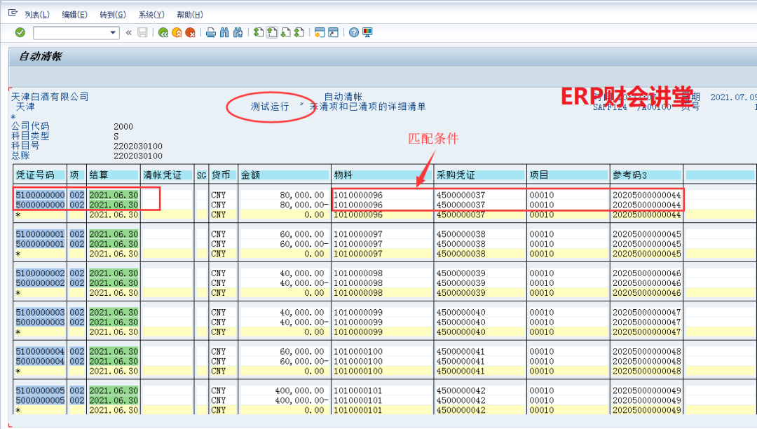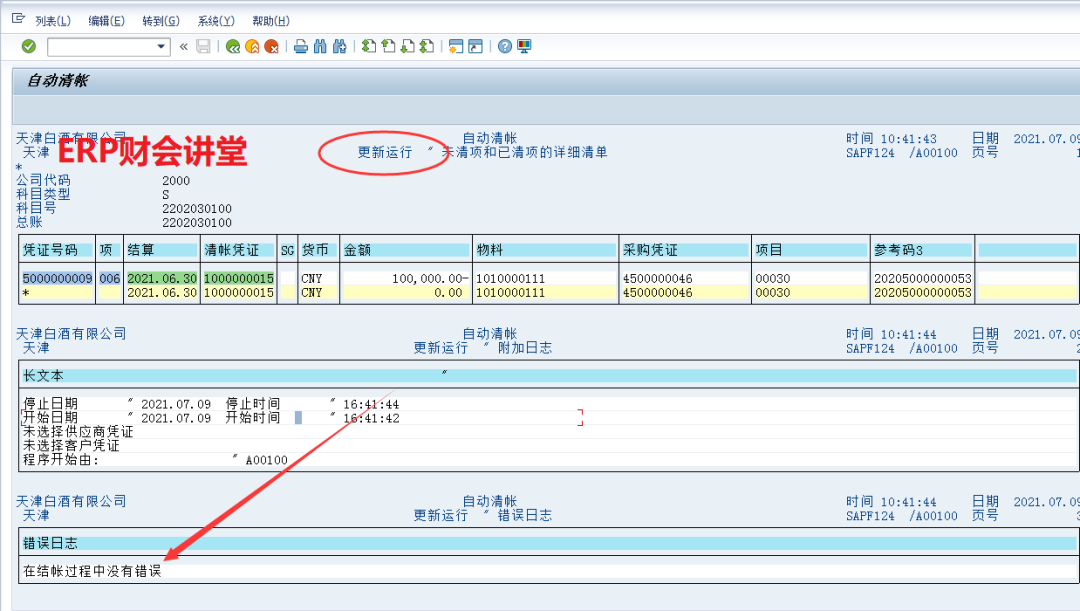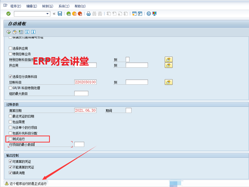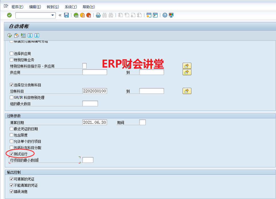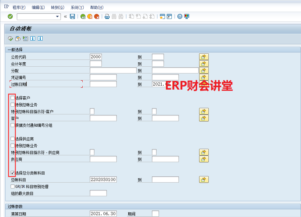 ![]() F.13可以對客戶、供應(yīng)商、總賬科目進(jìn)行清賬,如果對“應(yīng)付暫估”科目清賬,勾選“選擇總分類賬科目”,并輸入對應(yīng)的會計科目編號。如上參數(shù),表示對2000公司代碼下,記賬科目2202030100截至2021年6月30所有的記賬明細(xì)進(jìn)行清賬。