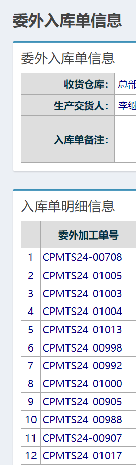點擊查看委外入庫單,若有多個單號的就會重復(fù)顯示 操作: 倉庫管理-物料入庫管理-委外入庫管理-委外入庫單管理
