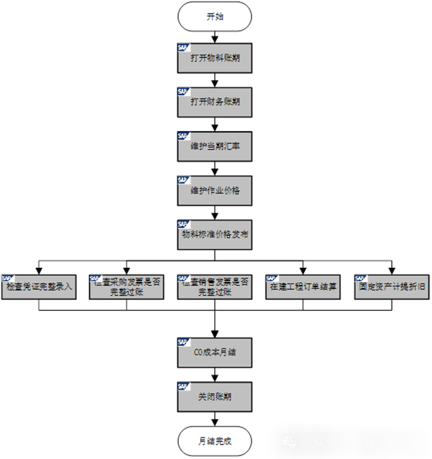 SAP的月結(jié)大致可以分為四個(gè)方面:月初準(zhǔn)備、FI月結(jié)、CO月結(jié)、關(guān)賬?!霸鲁鯗?zhǔn)備”是為了次月的業(yè)務(wù)能夠正常運(yùn)行,這對(duì)7×24小時(shí)生產(chǎn)的企業(yè)尤為重要;“CO月結(jié)”是月結(jié)的重點(diǎn);“關(guān)賬”后即可出具報(bào)表。不同的企業(yè)在月結(jié)步驟上略有差異,但主要內(nèi)容都是一致的,具體月結(jié)步驟如下。