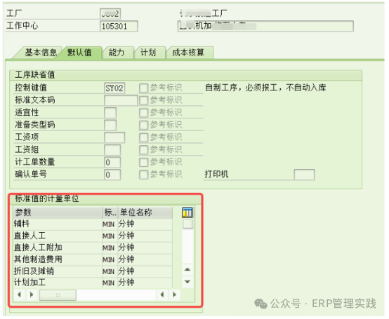 工作中心類別:是用于區(qū)分工作中心的范疇或類別; 負(fù)責(zé)人員:用來區(qū)分工作中心的專業(yè)能力 例如:Z01 裝配、Z02 調(diào)試、Z03 油漆、Z04 焊接、Z05 機(jī)加、Z06 表面處理、Z07 下料、Z08 成型、Z09 外協(xié)、Z10 檢驗(yàn)、Z11 其他 反沖:與物料主數(shù)據(jù)的反沖配合使用 物料主數(shù)據(jù)中反沖標(biāo)識為 1,表示一直反沖 物料主數(shù)據(jù)中反沖標(biāo)識為 2,在生產(chǎn)訂單中組件對應(yīng)的工序工作中心為反沖,則物料反沖 2、默認(rèn)值視圖 工作中心默認(rèn)值的計(jì)量單位需要維護(hù),不然工藝路線下發(fā)的時(shí)候無單位的工時(shí)會(huì)置零。