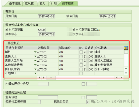 4、成本核算視圖 有效開始日期要在成本中心有效期之內(nèi) ① ACT001 輔料作業(yè)類型核算正常輔料和散裝物料消耗費(fèi)用; ② ACT002 直接人工作業(yè)類型核算一線制造工人基本工資和勞務(wù)工人工資; ③ ACT003 直接人工附加作業(yè)類型核算一線制造工人和勞務(wù)工人的五險(xiǎn)一金、福利費(fèi)、職工教育經(jīng)費(fèi)、專項(xiàng)獎(jiǎng)金等; ④ ACT004 折舊及攤銷作業(yè)類型核算制造部門廠房、設(shè)備折舊費(fèi)用和制造部門承擔(dān)的無形資產(chǎn)攤銷; ⑤ ACT005 其他制造費(fèi)用作業(yè)類型核算制造部門管理人員工資/五險(xiǎn)一金/福利費(fèi)/職工教育經(jīng)費(fèi)/專項(xiàng)獎(jiǎng)金、制造部門承擔(dān)的水電費(fèi)、差旅費(fèi)等費(fèi)用; ⑥ 計(jì)劃加工表示生產(chǎn)的節(jié)拍耗時(shí),作為排產(chǎn)計(jì)算依據(jù)。