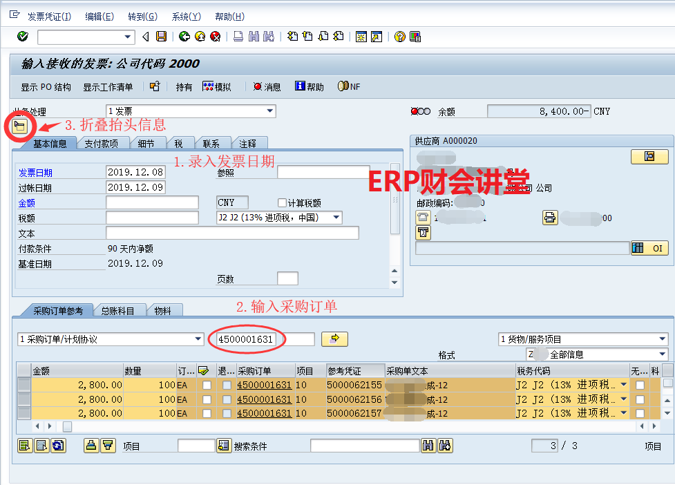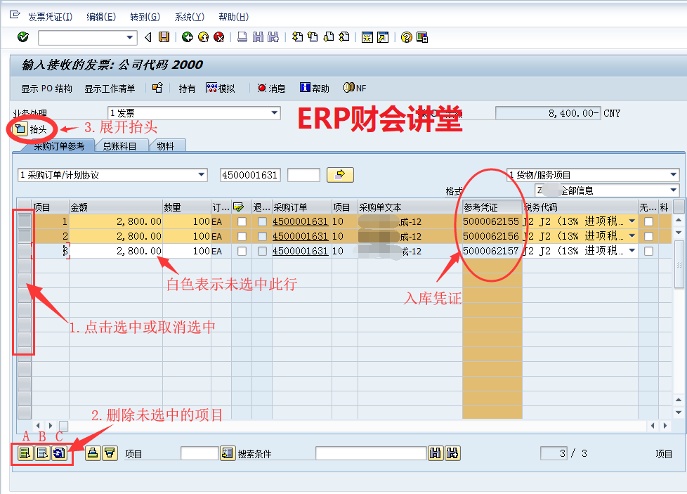 錄入發(fā)票日期,采購訂單號后回車,系統(tǒng)會自動帶出已入庫物料的數(shù)量及金額。系統(tǒng)默認選中所有未匹配發(fā)票的入庫憑證,如果記錄太多,可以將抬頭信息折疊。