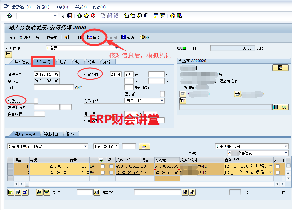 在上圖界面中,根據(jù)發(fā)票數(shù)量匹配入庫憑證,然后點擊右下角的圖標C刪除未匹配的行。接下來校對發(fā)票的金額是否正確,如果有差異需要確認原因。確認無誤后錄入發(fā)票的總額及稅金(下圖)。 ![]() 第二步,核對付款條件等信息。在“支付款項”頁中核對付款條件、付款方式等信息。通常這些信息由供應(yīng)商主數(shù)據(jù)中帶過來,可以根據(jù)每次的實際情況進行調(diào)整。 ![]() 第三步,模擬發(fā)票。