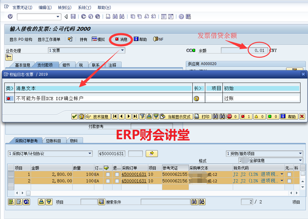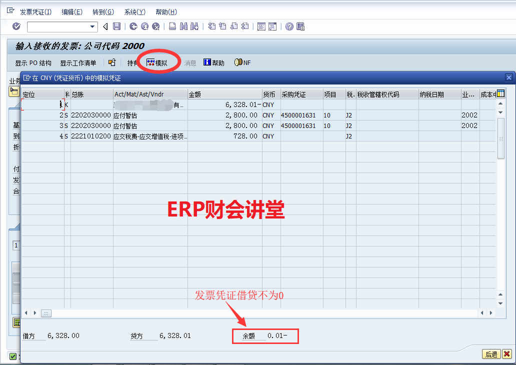上圖錯誤原因為發(fā)票的借/貸余額不為0,系統(tǒng)沒有找到記錄差異的科目。更改發(fā)票金額使借/貸余額相等,再次模擬,“消息”處不再提示錯誤。