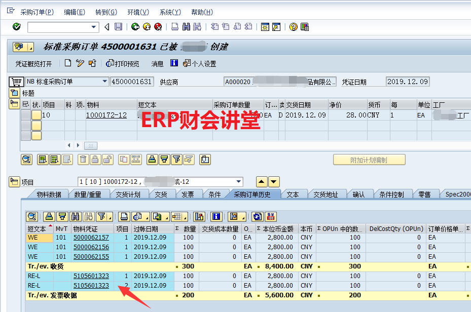 發(fā)票校驗是SAP采購流程中的重要環(huán)節(jié),收到供應(yīng)商發(fā)票之后,需要在SAP中匹配入庫記錄,并核對數(shù)量和金額是否正確,如有差異需要進一步確認原因,必要時將發(fā)票退回給供應(yīng)商。 SAP中發(fā)票校驗可以通過事務(wù)碼MIRO由財務(wù)一步處理,也可以先由業(yè)務(wù)預(yù)制發(fā)票(MIR7),然后財務(wù)審核過賬發(fā)票(MIR4)。本文以MIRO為例,介紹SAP中發(fā)票校驗的具體操作。 系統(tǒng)中有如下采購訂單,數(shù)量為500,訂單收貨3次,每次數(shù)量100,查看采購訂單歷史如下圖。當前收到供應(yīng)商發(fā)票,數(shù)量為200,接下來MIRO進行發(fā)票處理。 ![]() 第一步,匹配入庫憑證。