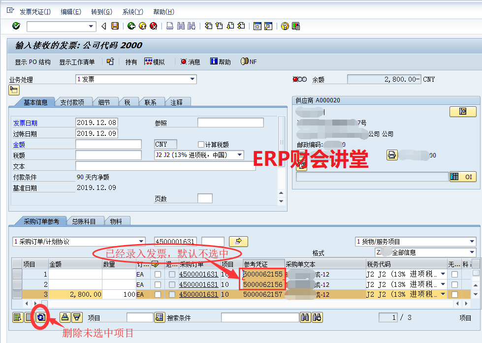 訂單的入庫數(shù)量為300,發(fā)票數(shù)量為200。并且再次對訂單錄入發(fā)票時,已經(jīng)匹配發(fā)票的入庫憑證默認未選中,可以直接點擊右下角的圖標刪除項目。并且,通過后臺配置,可以實現(xiàn)一張物料憑證只能匹配一次發(fā)票,防止重復(fù)的發(fā)票校驗。