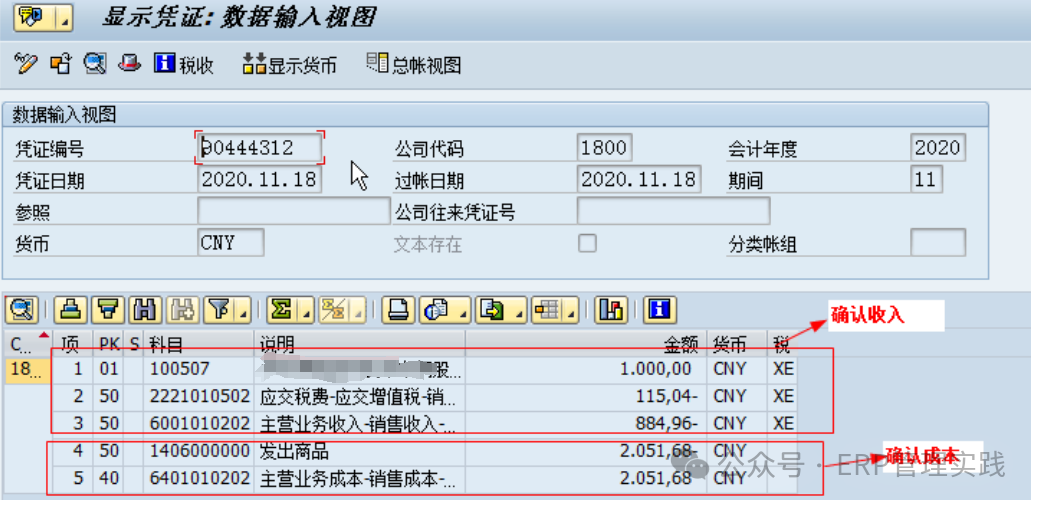 3、顯示預(yù)制銷售發(fā)票過(guò)賬憑證(FB03) 輸入憑證編號(hào),查看銷售確認(rèn)收入及確認(rèn)成本情況;