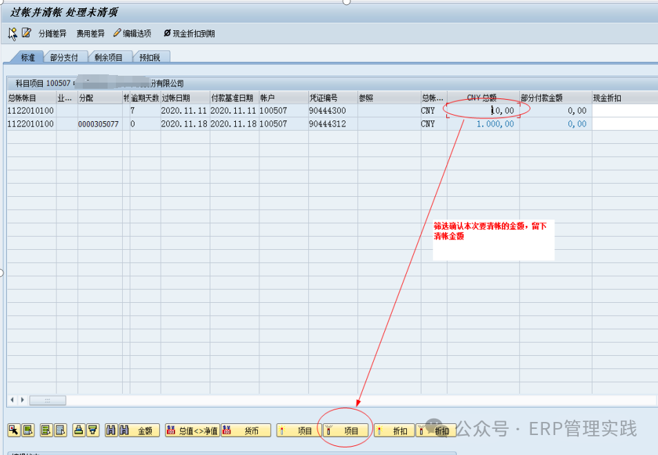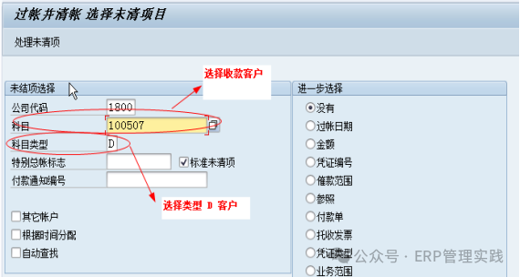 4、銷售客戶收款憑證清賬(F-04) 對(duì)未清的會(huì)計(jì)憑證進(jìn)行清賬。清賬的過(guò)程涉及將某個(gè)或某些未清項(xiàng)與已發(fā)生的交易或支付進(jìn)行匹配,從而結(jié)束這些未清項(xiàng)的狀態(tài),確保財(cái)務(wù)數(shù)據(jù)的準(zhǔn)確性和完整性。掛帳當(dāng)收到客戶回款,系統(tǒng)根據(jù)銷售訂單、掛帳日期等列示出符合條件的客戶未清項(xiàng),選擇需要沖銷的未清項(xiàng),將收到的回款與選擇的未清項(xiàng)鉤稽起來(lái),從而使未清項(xiàng)變?yōu)橐亚屙?xiàng)的過(guò)程。