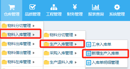 操作步驟:倉庫管理-物料入庫管理-生產(chǎn)入庫管理-新增生產(chǎn)入庫單,如下圖所示: