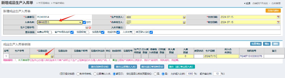 進(jìn)入界面后,選擇對應(yīng)的入庫倉位,再點擊明細(xì)欄的物料編碼欄位,如下圖所示: