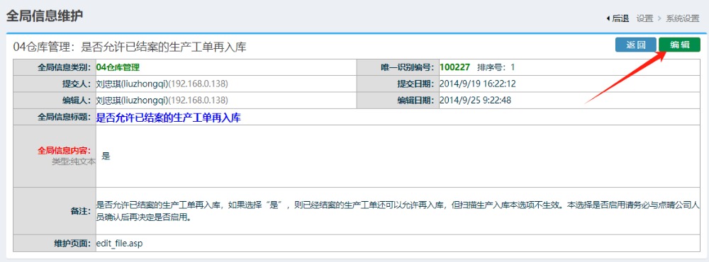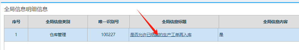 進(jìn)入界面后,搜索“已結(jié)案”,找到“是否允許已結(jié)案的生產(chǎn)工單再入庫”明細(xì)欄,點擊對應(yīng)字樣鏈接進(jìn)入