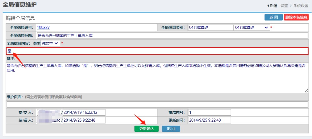 進(jìn)入界面后,點擊編輯按鈕,將內(nèi)容改成是,點擊“更新確認(rèn)”即可,如下圖所示: