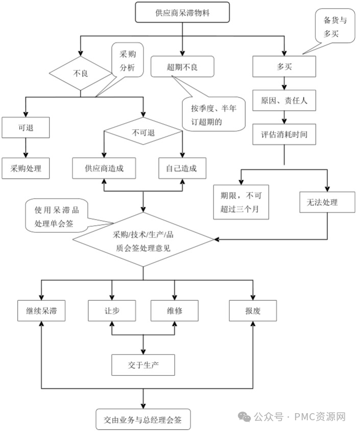 備注: 1.可二次使用:倉庫存放方式需(防潮、防塵、防撞)光器件產(chǎn)品半年內(nèi)報檢一次,機柜類三個月報檢一次; 2.原退回的或后續(xù)產(chǎn)生的呆滯品生產(chǎn)按計劃部提供的生產(chǎn)轉(zhuǎn)序單逐步消化或拆解; 4.5.2 供應(yīng)商呆滯物料處理流程圖: