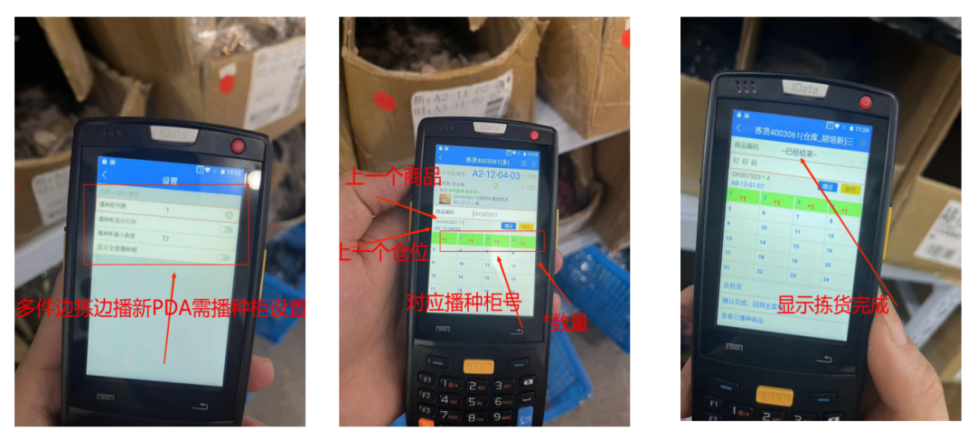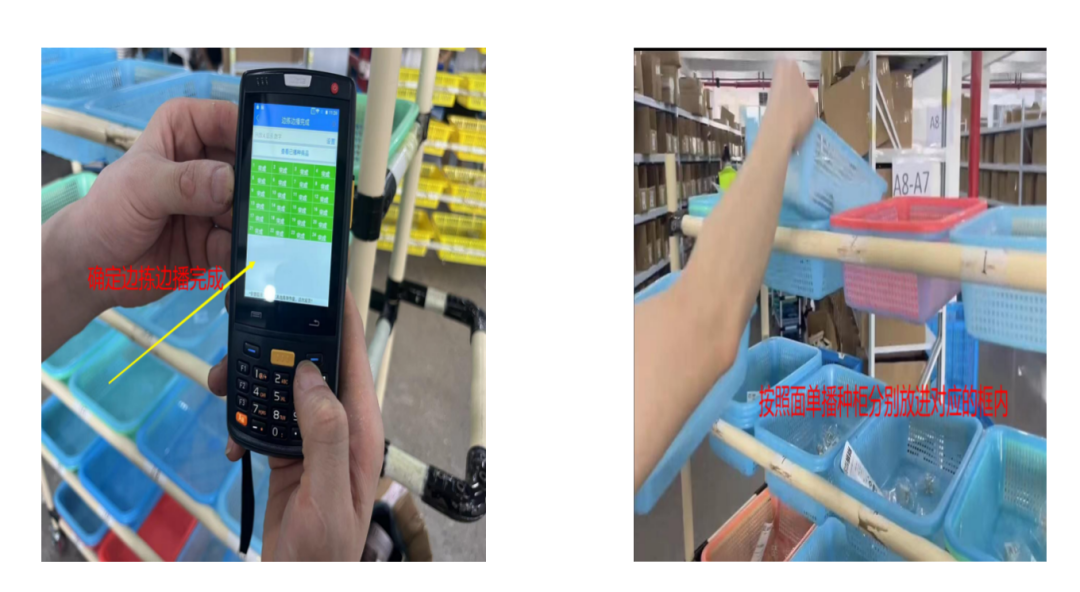 4、在PDA上確認(rèn)揀貨完成后,按照面單播種柜上顯示將商品分別放入對(duì)應(yīng)的框內(nèi),揀貨完成。