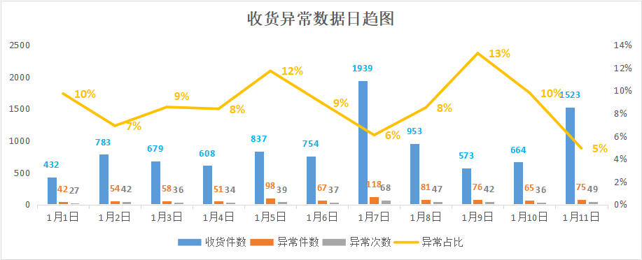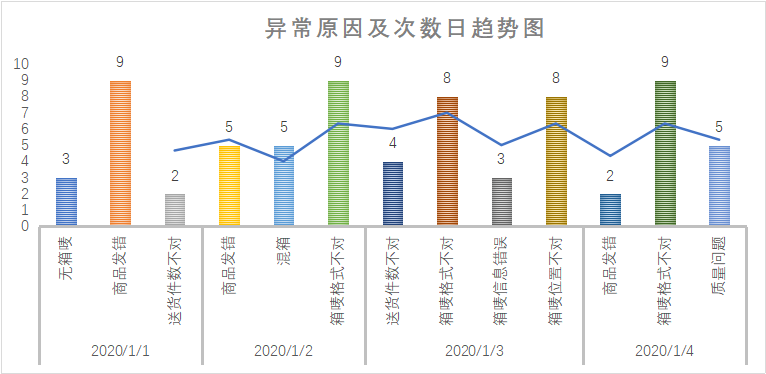 對(duì)比每日的收貨件數(shù)、異常件數(shù)及異常次數(shù),作為倉(cāng)庫(kù)管理者的管理類圖表之一,快速掌握每日收貨異常情況,并關(guān)注異常問(wèn)題是否逐日改善。 3.異常原因及次數(shù)日趨勢(shì)圖