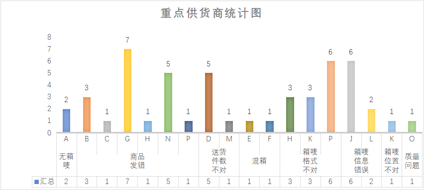 此表可以直接反應(yīng)出異常原因的占比情況,有利于倉(cāng)庫(kù)針對(duì)性的做出改善策略,并可以直觀跟蹤改善措施執(zhí)行后,對(duì)應(yīng)的異常問(wèn)題是否有所改觀。 4.重點(diǎn)供應(yīng)商統(tǒng)計(jì)