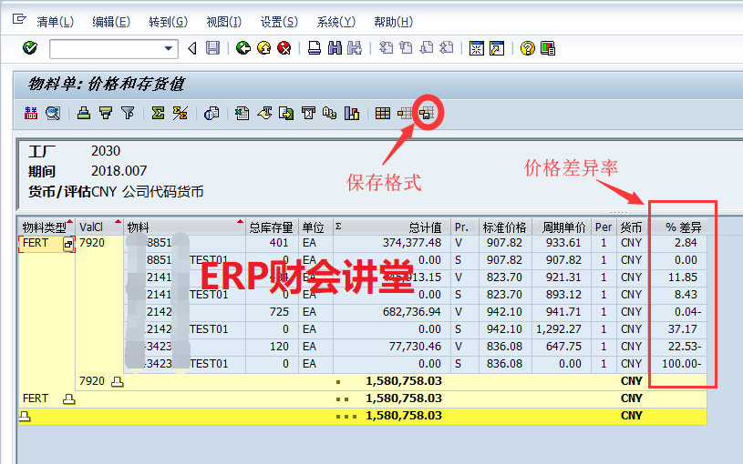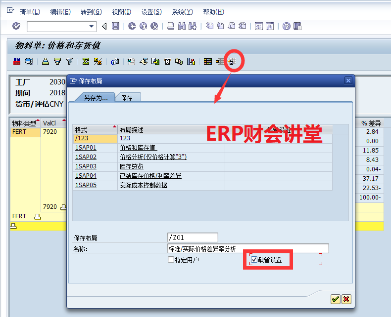通常情況下,成本會(huì)計(jì)重點(diǎn)關(guān)注標(biāo)準(zhǔn)價(jià)和實(shí)際價(jià)差異率較大的物料就可以了,比如超過20%重點(diǎn)關(guān)注,低于5%視為合理差異。今天就給大家介紹SAP中非常好用的一個(gè)價(jià)格分析報(bào)表S_P99_41000062(物料價(jià)格和庫存分析)。雙擊,進(jìn)入S_P99_41000062的初始界面如下,報(bào)表S_P99_41000062可以按會(huì)計(jì)期間查詢工廠物料的價(jià)格及庫存值,如果只想查看產(chǎn)成品,可以點(diǎn)擊上圖紅框的中的圖標(biāo)展開選擇界面。按如上條件執(zhí)行后,報(bào)表輸出結(jié)果如下,報(bào)表輸出物料的庫存數(shù)量、庫存價(jià)值、以及對應(yīng)期間的標(biāo)準(zhǔn)價(jià)和實(shí)際價(jià)。選擇上圖紅圈中的圖標(biāo)設(shè)置輸出格式,將“百分比價(jià)格差異”導(dǎo)出后,報(bào)表顯示如下,可以看到每一個(gè)物料標(biāo)準(zhǔn)價(jià)與實(shí)際價(jià)格的差異。這樣,我們就快速找到了成本異常的產(chǎn)品,那接下來該如何去分析成本異常的原因呢?另外,點(diǎn)擊上圖紅圈中的圖標(biāo),可以將格式保存下來,避免每次都去設(shè)置格式。我們可以將此格式設(shè)置為缺省格式,后續(xù)執(zhí)行報(bào)表S_P99_41000062即可輸出價(jià)格差異列。