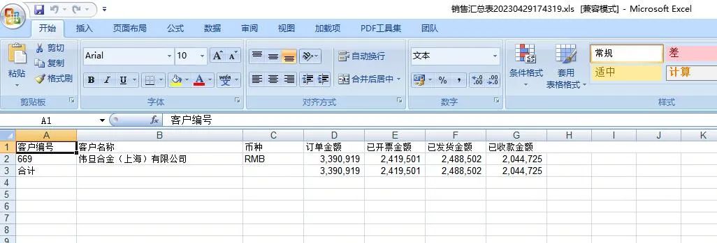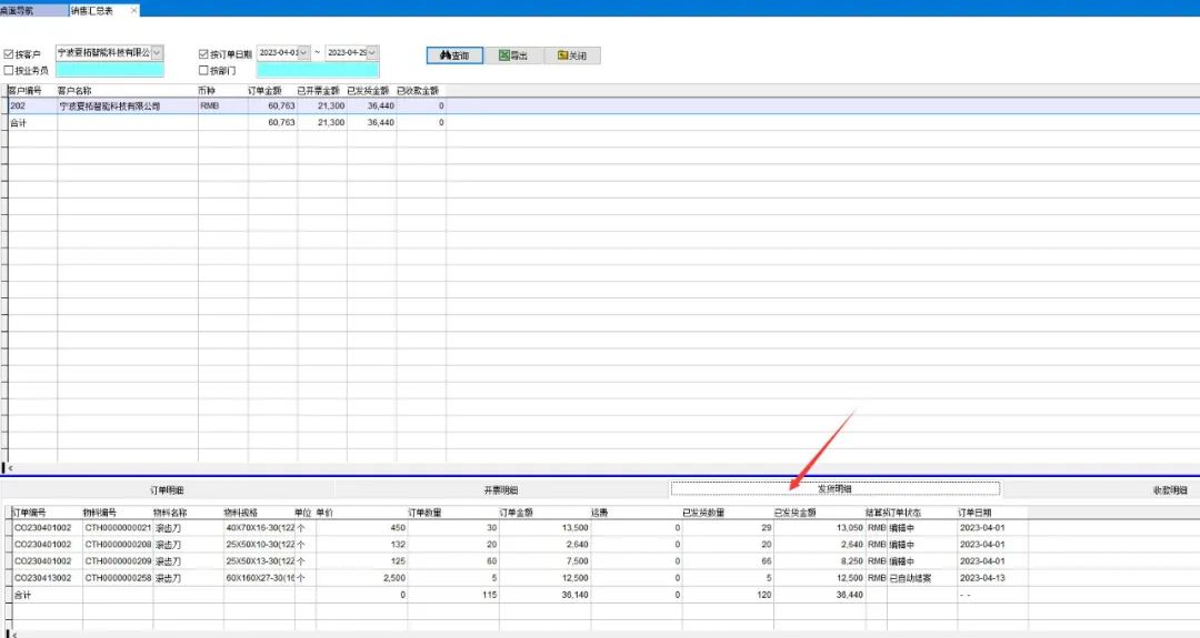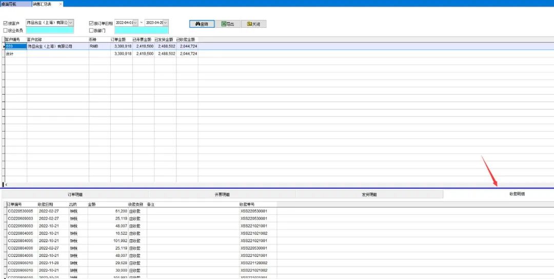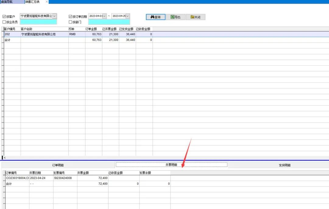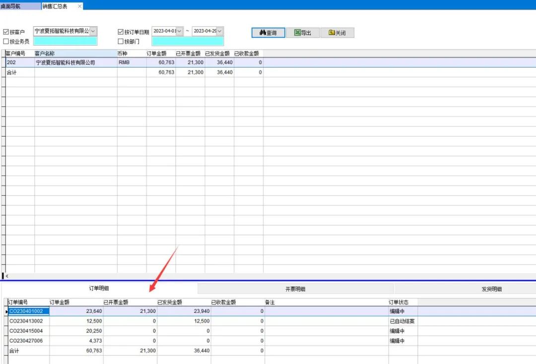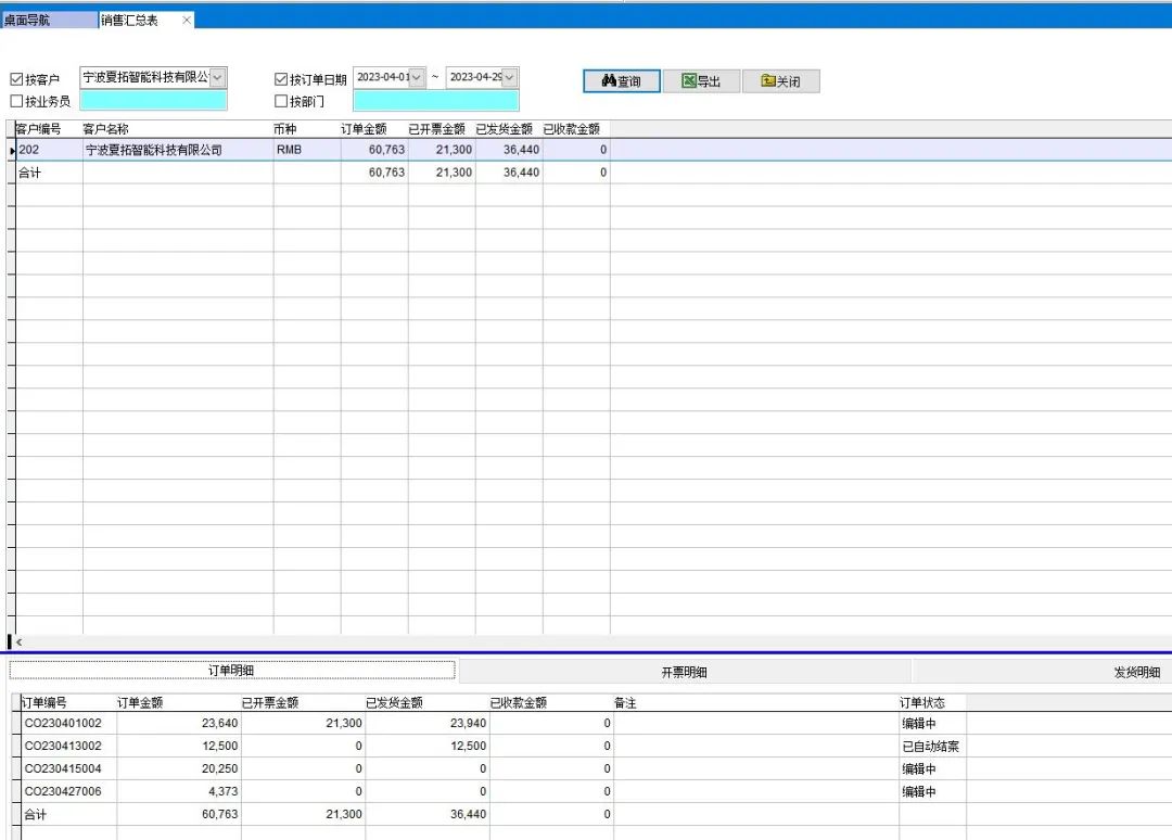 訂單明細(xì) 顯示該客戶這段時(shí)間內(nèi)的所有訂單執(zhí)行情況,一個(gè)訂單一行記錄,包括訂單金額、開(kāi)票金額、發(fā)貨金額、收款金額