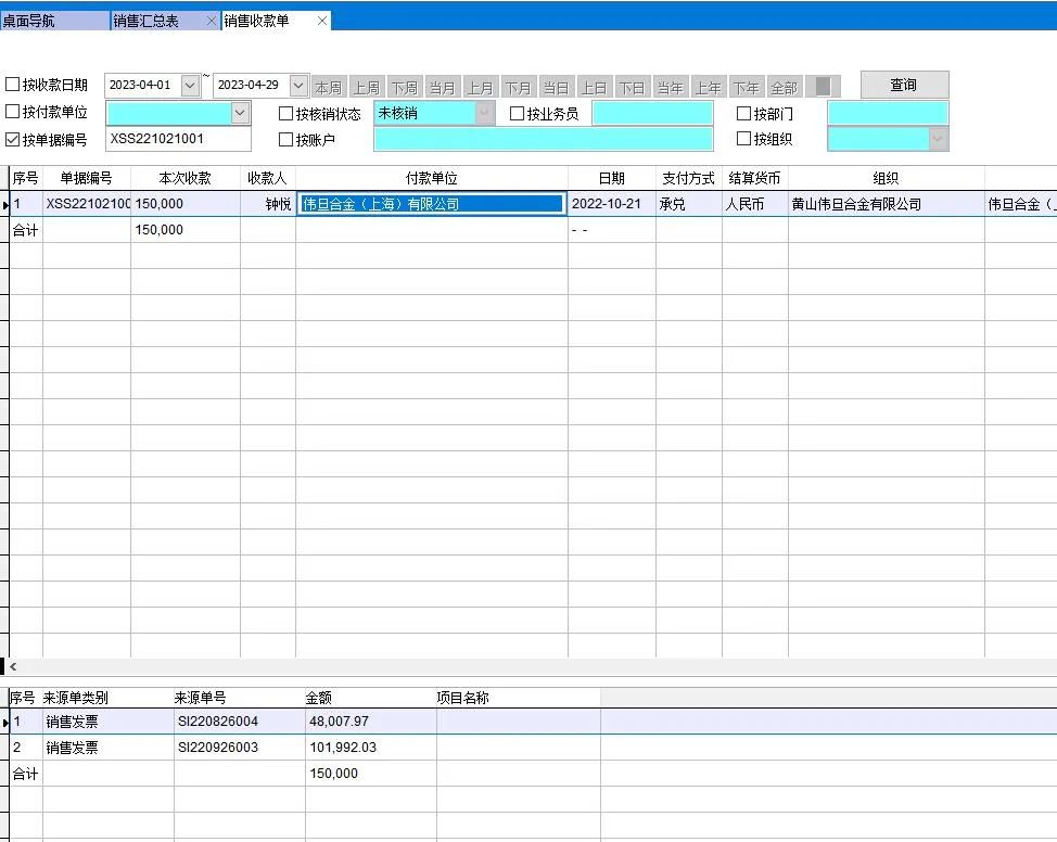 打開(kāi)路徑:【主菜單】->【銷售】-> 【報(bào)表】->【銷售匯總表】 銷售匯總表是綜合反映一段時(shí)間內(nèi)銷售訂單的執(zhí)行情況,包括訂單情況、開(kāi)票情況、已發(fā)貨情況、已收款情況。 銷售匯總表上半部分是某客戶總的訂單金額、已開(kāi)票金額、已發(fā)貨金額、已收款金額,金額都是含稅金額。每個(gè)客戶一行記錄。下半部分是顯示該客戶所有銷售訂單、銷售發(fā)票、銷售發(fā)貨單、銷售收款單