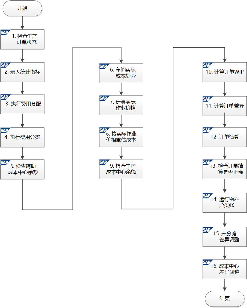 5)檢查總賬憑證是否錄入完成:FB03查看憑證清單,檢查當(dāng)期各類憑證是否錄入完成,是否存在對成本有影響的費(fèi)用沒有錄入。如果已經(jīng)結(jié)賬后發(fā)現(xiàn)還有費(fèi)用沒有錄入,只有反結(jié)賬,錄入費(fèi)用后重新結(jié)賬。6)檢查采購預(yù)制發(fā)票是否過賬:MIR5查看發(fā)票憑證清單。如果企業(yè)使用了采購發(fā)票預(yù)制功能,結(jié)賬前需檢查是否所有的預(yù)制發(fā)票已經(jīng)過賬。采購發(fā)票預(yù)制會占用會計憑證編號,如果預(yù)制后又刪除,會造成會計憑證斷號。7)檢查銷售預(yù)制發(fā)票是否過賬:VF05N查看銷售發(fā)票清單。如果企業(yè)使用了銷售發(fā)票預(yù)制功能,結(jié)賬前需檢查是否所有的預(yù)制發(fā)票已經(jīng)過賬。8)在建工程訂單結(jié)算:KO8G訂單結(jié)算,如果啟用了投資管理功能進(jìn)行在建工程管理,月底時需要對在建工程訂單進(jìn)行結(jié)算,將訂單成本結(jié)轉(zhuǎn)到在建工程上。9)運(yùn)行折舊:AFAB運(yùn)行折舊,AFBP查看折舊運(yùn)行日志。10)檢查生產(chǎn)訂單狀態(tài):COHV批量處理訂單,CO02單個修改訂單,COOIS訂單信息系統(tǒng)。生產(chǎn)訂單結(jié)算之前,財務(wù)人員需要檢查訂單是否關(guān)閉,訂單報工是否正確,訂單的投入產(chǎn)出是否合理。例如生產(chǎn)100輛汽車,只消耗了50臺發(fā)動機(jī),明顯不合常理。本步驟非常關(guān)鍵,影響到產(chǎn)品成本是否準(zhǔn)確。如果結(jié)賬完成后,發(fā)現(xiàn)成本異常,回頭分析發(fā)現(xiàn)物料消耗不準(zhǔn)確,此時需要反結(jié)賬,然后再重新結(jié)賬。這樣不僅麻煩,而且產(chǎn)生了許多不必要的會計憑證。11)統(tǒng)計指標(biāo)錄入:KB31N錄入統(tǒng)計指標(biāo)。如果費(fèi)用在不同的成本中心之間按固定比例分配,則忽略此步驟;如果按統(tǒng)計指標(biāo)分配,則需要錄入統(tǒng)計指標(biāo)的量。12)執(zhí)行費(fèi)用分配:KSV5執(zhí)行分配循環(huán),KSV3顯示分配循環(huán)。本步驟將公共成本中心的費(fèi)用分配到不同的成本中心。例如,將水電車間的費(fèi)用,分配到不同的生產(chǎn)車間。13)執(zhí)行費(fèi)用分?jǐn)?/span>:KSU5執(zhí)行分?jǐn)傃h(huán),KSU3顯示分?jǐn)傃h(huán)。本步驟作用同費(fèi)用分配,只是將公共成本中心的費(fèi)用以次級成本要素的方式分配到其他成本中心。執(zhí)行完費(fèi)用分配/分?jǐn)傊?,需要檢查公共成本中心的余額是否為0。14)實際成本劃分:KSS2執(zhí)行費(fèi)用分割,將生產(chǎn)成本中心的費(fèi)用進(jìn)行分組,計算每出一組的金額。15)計算實際作業(yè)價格:KSII計算作業(yè)類型實際價格,根據(jù)上一步計算的金額除以成本中心作業(yè)類型數(shù)量得到實際單價。計算完成后通過KSBT檢查作業(yè)價格,如果價格為0說明計算失敗。16)按實際價格重估訂單成本:CON2按實際價格重估。訂單報工時以計劃作業(yè)價格從成本中心結(jié)轉(zhuǎn)成本到訂單,月底得到成本中心實際費(fèi)用后,計算出實際作業(yè)價格,將作業(yè)成本差異調(diào)整到生產(chǎn)訂單上。執(zhí)行完CON2之后,需要檢查生產(chǎn)成本中心余額是否為0,如果不為0需分析原因,再進(jìn)行下一步操作。17)計算訂單WIP:KKAO計算生產(chǎn)訂單在產(chǎn)品金額。18)計算訂單差異:KKS1/KKS5計算生產(chǎn)訂單投入產(chǎn)出差異。19)訂單結(jié)算:CO88生產(chǎn)訂單結(jié)算。執(zhí)行完CO88后,需要檢查訂單結(jié)算是否正確,公式為“生產(chǎn)成本-投入 + 制造費(fèi)用 = 生產(chǎn)成本-產(chǎn)出”。例如生產(chǎn)成本科目編號為5001開頭,核對5001*科目的余額和生產(chǎn)成本中心費(fèi)用總額是否相等即可。20)運(yùn)行物料分類賬:CKMLCP運(yùn)行物料分類賬。運(yùn)行物料分類賬主要處理以標(biāo)準(zhǔn)價計價物料的差異,運(yùn)行完物料分類賬之后,差異科目余額應(yīng)為0。一般執(zhí)行到“過賬清算”時,執(zhí)行CKMVFM分析未分?jǐn)偛町?,然后再?zhí)行“過賬清算”。21)未分?jǐn)偛町愓{(diào)整:F-02錄入憑證。執(zhí)行完CKMLCP之后如果存在未分?jǐn)偛町?,手工將差異科目調(diào)整為0,一般調(diào)整至主營業(yè)務(wù)成本。22)成本中心差異調(diào)整:F-02錄入憑證。執(zhí)行CON2作業(yè)價格重估后,成本中心可能存在尾差(一般都是幾分錢),手工將其調(diào)整至主營業(yè)務(wù)成本。如果以標(biāo)準(zhǔn)價計價的物料消耗到成本中心,執(zhí)行完CKMLCP之后差異被重估到成本中心,此差異也需要調(diào)整到主營業(yè)務(wù)成本。
