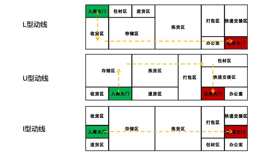 1、L型動線 可以應(yīng)對進出貨高峰同時發(fā)生的情況;適合越庫作業(yè)的進行;可同時處理“快流”及“慢流”的貨物。 2、U型動線 出入口在倉庫的同側(cè),根據(jù)進出貨頻率大小,將流量大的商品安排在靠近進出口端的存儲區(qū),縮短商品的揀貨搬運路線。 3、I型動線 出入口在倉庫的相對面,無論訂單大小與揀貨品相多少,均要通過倉庫全程,適合作業(yè)流程簡單、規(guī)模較小的作業(yè)。