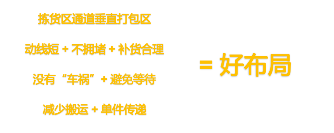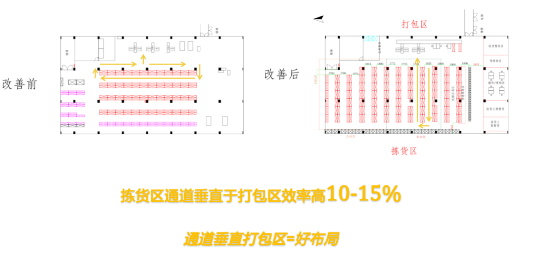 這里需要特別提醒倉庫管理者在設(shè)計通道的時候,尤其要注意揀貨通道的設(shè)計朝向,經(jīng)過數(shù)據(jù)測算,揀貨通道垂直于打包區(qū)為最佳通道朝向。