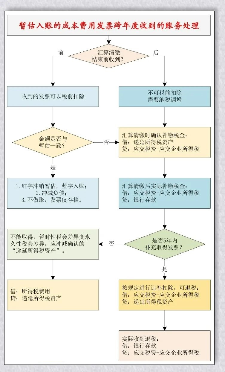 企業(yè)執(zhí)行《企業(yè)會(huì)計(jì)準(zhǔn)則》,對(duì)于實(shí)際發(fā)生但未收到發(fā)票的成本費(fèi)用已經(jīng)暫估入賬計(jì)入了當(dāng)期的損益,企業(yè)所得稅按照會(huì)計(jì)核算數(shù)據(jù)進(jìn)行了預(yù)繳申報(bào),年終時(shí)按照預(yù)估匯算清繳前能收到發(fā)票進(jìn)行了所得稅會(huì)計(jì)處理。 跨年后實(shí)際收到發(fā)票,可能是匯算清繳結(jié)束前收到,也可能是匯算清繳結(jié)束后收到,該分別如何進(jìn)行賬務(wù)處理? 跨年后實(shí)際收到發(fā)票,可能與暫估金額一致,也可能不一致,不一致的差額后期可能繼續(xù)收到,也可能無法收到,該分別如何進(jìn)行賬務(wù)處理? ![]() 暫估入賬的成本費(fèi)用發(fā)票跨年度后才收到,需要區(qū)分匯算清繳結(jié)束前收到和匯算清繳結(jié)束后收到。 一、匯算清繳結(jié)束前收到發(fā)票 根據(jù)具體情形的不同,分別進(jìn)行不同的賬務(wù)處理。 (一)紅字沖銷暫估,藍(lán)字入賬 【案例1】A公司為一家商貿(mào)企業(yè),一般納稅人,2×23年12月從供應(yīng)商甲公司購進(jìn)一批商品,不含稅價(jià)100萬元,已經(jīng)全部暫估入庫和對(duì)外銷售,確認(rèn)了銷售收入和銷售成本。2×24年1月25日經(jīng)過對(duì)賬后,收到甲公司的增值稅專票,并轉(zhuǎn)賬支付了貨款113萬元。 A公司2×24年1月的會(huì)計(jì)分錄: 1.月初紅字沖銷暫估入庫: 借:庫存商品-xx 100萬元(紅字) 貸:應(yīng)付賬款-暫估入賬 100萬元(紅字) 2.實(shí)際收到發(fā)票并付款: 借:庫存商品-xx 100萬元 貸:銀行存款 113萬元 (二)沖減負(fù)債 【案例2】B公司因?yàn)橘Y金緊張,向乙公司借了一筆資金,B公司在2×23年關(guān)賬時(shí)前計(jì)提了該下半年度利息1萬元,計(jì)入了“財(cái)務(wù)費(fèi)用”和“應(yīng)付利息”科目。乙公司在2×24年1月5日開具了利息發(fā)票,B公司收到發(fā)票后轉(zhuǎn)賬支付了該筆利息。假定該利息可全額稅前扣除。 B公司2×24年1月的會(huì)計(jì)分錄: 借:應(yīng)付利息 1萬元 貸:銀行存款 1萬元 (三)無需賬務(wù)處理 【案例3】C公司因?yàn)橘Y金緊張,向某銀行借了一筆資金,C公司銀行賬戶在2×23年12月被銀行直接劃扣了利息10萬元,C公司減少了“銀行存款”并計(jì)入了“財(cái)務(wù)費(fèi)用”科目。C公司在2×24年3月才收到銀行開具的利息發(fā)票。假定該利息可全額稅前扣除。 解析: C公司收到在上年度已經(jīng)實(shí)際支付的利息發(fā)票,由于會(huì)計(jì)核算已經(jīng)正確處理的,不再需要重復(fù)做賬務(wù)處理,只需要將發(fā)票粘貼在利息支付的會(huì)計(jì)憑證后,或者單獨(dú)存檔以備檢查,都是可以的。 (四)綜合情況 【案例4】D公司為一家商貿(mào)企業(yè),一般納稅人,2×23年12月從供應(yīng)商丁公司購進(jìn)一批商品,不含稅價(jià)200萬元,已經(jīng)全部暫估入庫和對(duì)外銷售,確認(rèn)了銷售收入和銷售成本。2×24年1月25日收到丁公司的增值稅專票價(jià)稅合計(jì)113萬元,并轉(zhuǎn)賬支付了貨款113萬元。其余發(fā)票在匯算清繳前沒有收到,納稅調(diào)增補(bǔ)繳了企業(yè)所得稅25萬元。2×24年7月25日收到丁公司的增值稅專票價(jià)稅合計(jì)113萬元,并轉(zhuǎn)賬支付了貨款113萬元,然后按規(guī)定辦理了追補(bǔ)扣除的專項(xiàng)申報(bào),申請(qǐng)退還了企業(yè)所得稅25萬元。 D公司2×24年1月的會(huì)計(jì)分錄: 1.月初紅字沖銷暫估入庫: 借:庫存商品-xx 200萬元(紅字) 貸:應(yīng)付賬款-暫估入賬 200萬元(紅字) 說明:月末時(shí),對(duì)于未收到發(fā)票部分,繼續(xù)暫估。 2.實(shí)際收到發(fā)票并付款: 借:庫存商品-xx 100萬元 貸:銀行存款 113萬元 3.匯算期間納稅調(diào)增,確認(rèn)補(bǔ)繳的企業(yè)所得稅: 借:遞延所得稅資產(chǎn) 25萬元 貸:應(yīng)交稅費(fèi)-應(yīng)交企業(yè)所得稅 25萬元 實(shí)際補(bǔ)繳企業(yè)所得稅: 借:應(yīng)交稅費(fèi)-應(yīng)交企業(yè)所得稅 25萬元 貸:銀行存款 25萬元 4.實(shí)際收到發(fā)票并支付貨款,與前述1月份會(huì)計(jì)分錄一致,不贅述。 5.追補(bǔ)扣除,確認(rèn)應(yīng)退稅額: 借:應(yīng)交稅費(fèi)-應(yīng)交企業(yè)所得稅 25萬元 貸:遞延所得稅資產(chǎn) 25萬元 實(shí)際收到退稅款: 借:銀行存款 25萬元 貸:應(yīng)交稅費(fèi)-應(yīng)交企業(yè)所得稅 25萬元 二、匯算期間結(jié)束后收到發(fā)票 在匯算清繳結(jié)束前,未收到符合規(guī)定的稅前扣除憑證的,不得稅前扣除,需要納稅調(diào)增;然后,在匯算清繳結(jié)束后,5年內(nèi)補(bǔ)充取得符合規(guī)定的稅前扣除憑證(包括發(fā)票),是可以按規(guī)定追補(bǔ)扣除。 【案例5】E公司為一家商貿(mào)企業(yè),一般納稅人,2×23年12月從供應(yīng)商丙公司購進(jìn)一批商品,不含稅價(jià)100萬元,已經(jīng)全部暫估入庫和對(duì)外銷售,確認(rèn)了銷售收入和銷售成本。因?yàn)楸镜脑颍?×24年7月25日甲公司的才收到增值稅專票,并轉(zhuǎn)賬支付了貨款113萬元。E公司在匯算清繳時(shí)納稅調(diào)增補(bǔ)繳了企業(yè)所得稅25萬元,然后實(shí)際收到發(fā)票后再追補(bǔ)扣除申請(qǐng)退稅25萬元。 E公司的會(huì)計(jì)分錄: 1.月初紅沖,月末重新暫估,略。 2.匯算清繳時(shí)納稅調(diào)增,確認(rèn)補(bǔ)繳稅款: 借:遞延所得稅資產(chǎ