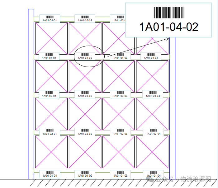 3、"五號(hào)位定位法": "五位數(shù)編號(hào)”是用五個(gè)數(shù)字或字母依次表示倉、排、格、層、板。 例如,"1A-01-04-1-2"即指1A倉、01貨架排數(shù)(通道)、04貨架格數(shù)、第1層貨架、2號(hào)托盤位。 備注編號(hào)時(shí),為防止出現(xiàn)錯(cuò)覺,可在第一位數(shù)字后加上拼音字母“K”、“C”或“P”來表示,這3個(gè)字母分別代表庫房、貨場(chǎng)、貨棚,或用其他字母代替。 02 具體貨架編號(hào)舉例 1、高位貨架貨物編碼原則與舉例 每組貨架中庫位編碼規(guī)則:1)自下而上順序編“層號(hào)”;2)自后向前順序編“庫位號(hào)”;3)層號(hào)和庫位號(hào)編碼為1位數(shù)。