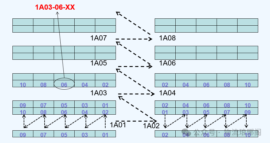 好處是系統(tǒng)可以根據(jù)位置確定揀貨路徑,比如1A01-10-XX、1A01-05-XX、1A03-06-XX可以一次性走過去揀貨,可以在系統(tǒng)中設(shè)置好事先的揀貨通道。 3、平倉區(qū)貨位編號(hào)舉例