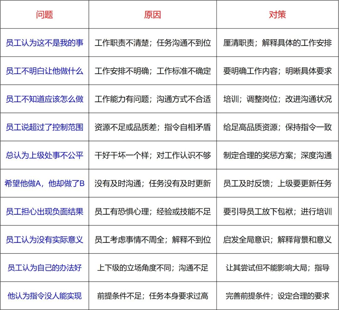 7.員工擔(dān)心出現(xiàn)負(fù)面結(jié)果10.員工認(rèn)為你的指令沒人能實(shí)現(xiàn)接下來,我們就分析上述問題的成因,看看怎么解決這些問題。這一問題的成因是:員工不清楚自己的工作職責(zé);上級在交代任務(wù)時(shí)溝通不到位。所以,上級要給下級一份清晰的工作職責(zé)說明,同時(shí),在安排工作時(shí),說明任務(wù)的必要性、關(guān)聯(lián)性并激發(fā)員工的責(zé)任感。這一問題的成因是:工作安排不明確;工作標(biāo)準(zhǔn)不確定。安排工作時(shí),沒有組織好信息,所以,員工不得要領(lǐng)?;蛘?,沒有提出明確的工作標(biāo)準(zhǔn),所以,員工不知道做到什么程度。因此,在安排工作時(shí),不但要組織好語言,還要提出具體要求,以利于下級理解和工作追蹤。這一問題的成因是:工作能力有問題;溝通方式不合適。對員工能力的培育,功夫要下在平時(shí)。從思維能力、人際能力、專業(yè)能力以及管理能力四個(gè)方面去培養(yǎng)員工。同時(shí),要注意改進(jìn)溝通方式,比如,先把工作分解到很容易理解的程度,員工就容易接受了。這一問題的成因是:完成任務(wù)的資源不足或品質(zhì)差;上級下達(dá)的指令自相矛盾。要為員工完成提供足夠的資源,同時(shí)要注意保證資源的品質(zhì)。有些事情,需要上級出面去協(xié)調(diào),因?yàn)橄录壴诼毼簧细鷮Ψ讲粚Φ?。要特別注意的是,上級在安排工作時(shí)要前后一致,不能自相矛盾,否則,員工會(huì)感覺不知所措、力不從心。這一問題的成因是:干好無獎(jiǎng)勵(lì),干壞無懲罰;員工對工作的認(rèn)識(shí)不夠。一個(gè)團(tuán)隊(duì),一個(gè)組織,提倡什么,反對什么,要讓每個(gè)成員了解,要制定合理的獎(jiǎng)懲方案。對員工各自的責(zé)任范圍、工作要求,要有明確界定和深度溝通。這一問題的成因是:雙方確認(rèn)和反饋;工作任務(wù)沒有及時(shí)更新。在布置工作時(shí),一定要聽聽下級的反應(yīng)。在任務(wù)執(zhí)行過程中,下級要及時(shí)反饋。如果任務(wù)發(fā)生變更,哪怕是工作標(biāo)準(zhǔn)提高了,上級也要及時(shí)告知下級。問題七:員工擔(dān)心出現(xiàn)負(fù)面結(jié)果這一問題的成因是:員工有恐懼心理;經(jīng)驗(yàn)或技能不足,擔(dān)心做不好事情。員工有恐懼心理,是因?yàn)樵?jīng)看到其他同事因完不成類似任務(wù)而被嚴(yán)厲批評或處罰過。所以,這就要求上級要對下級有一定的包容性,引導(dǎo)員工放下思想包袱。同時(shí),要讓有經(jīng)驗(yàn)的員工帶一帶那些經(jīng)驗(yàn)不足的員工,或者,上級親自培養(yǎng)。這一問題的成因是:員工考慮事情不周全;上級解釋不到位。因此,上級要啟發(fā)下級的全局意識(shí),幫他們樹立大局觀。另外,上級要解釋工作的背景和意義,與下級達(dá)成共識(shí)、形成共鳴。這一問題的成因是:下級立場和角度不同;溝通不足??梢宰寙T工按照自己的辦法去嘗試,但要控制風(fēng)險(xiǎn),不能影響大局。如果下級的辦法確實(shí)好,就要推廣他的做法,他會(huì)收獲成就感。如果下級的辦法有問題,就要抓住時(shí)機(jī),進(jìn)行指導(dǎo),做好員工的培養(yǎng)工作。問題十:員工認(rèn)為你的指令沒人能實(shí)現(xiàn)這一問題的成因是:前提條件或資源不足;上級的要求過高。所以,上級在安排工作時(shí),要考慮條件是否成熟、資源是否充足。另外,在安排工作時(shí),要根據(jù)員工的成熟度來,設(shè)定合理要求。
