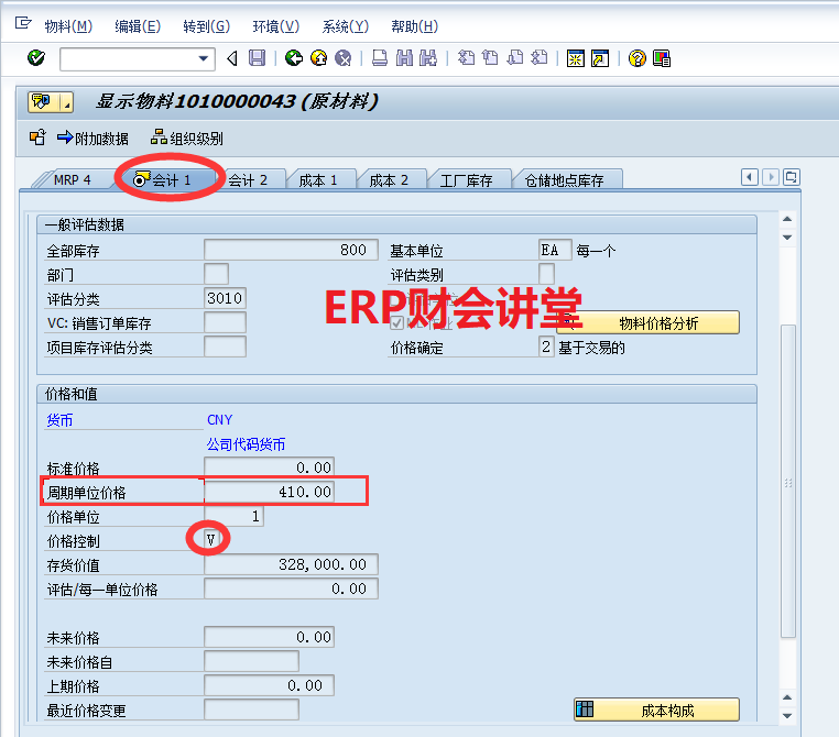 MR21更改價(jià)格之前,MM03查看物料1010000043的計(jì)價(jià)方式為移動(dòng)平均價(jià),價(jià)格為410.00,存貨總價(jià)值為328,000.00 。