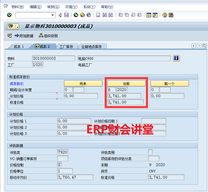 輸入物料號(hào)、新價(jià)格后,保存即可。說(shuō)明:此界面中,可以一次更改多個(gè)物料的價(jià)格。完成更改后,MM03再次查看物料價(jià)格如下,