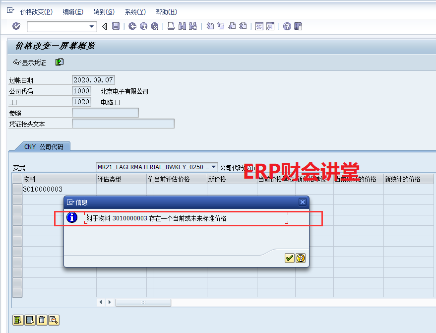 對(duì)物料3010000003更改標(biāo)準(zhǔn)價(jià)格時(shí),提示如下信息。