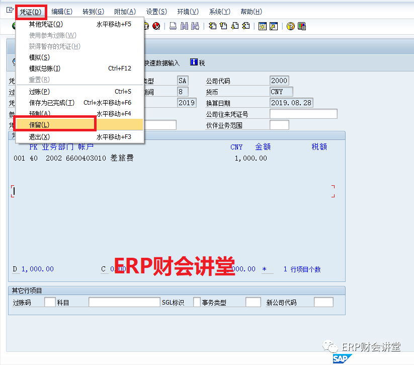 溫馨提示:選擇“保留”,不要選到“預(yù)制”了哦,保留和預(yù)制是兩個(gè)不同的概念。保留只是臨時(shí)存儲(chǔ),不會(huì)生成憑證號(hào),而預(yù)制會(huì)生成憑證號(hào)。暫存的憑證可以刪除,而預(yù)制的憑證不能刪除。